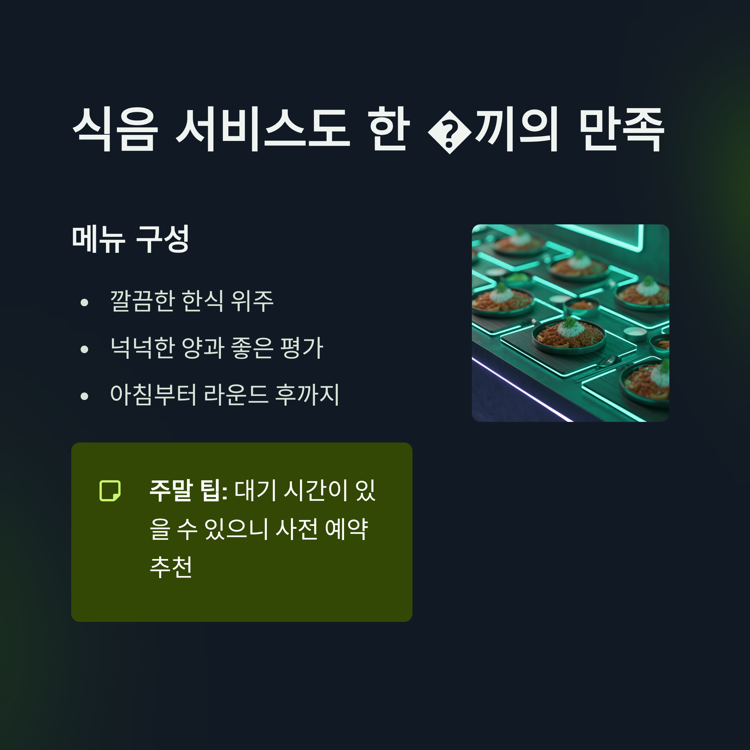 깔끔한 한식 위주로 제공되며, 양도 넉넉하고 맛도 평이 좋습니다.