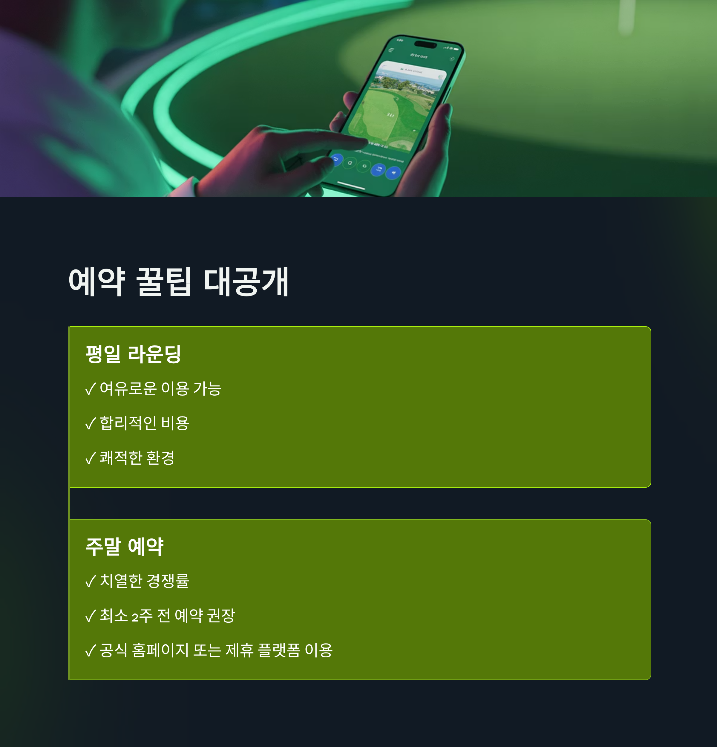 평일 라운딩을 선택하신다면 상대적으로 여유롭게 이용할 수 있고, 비용 면에서도 합리적입니다.