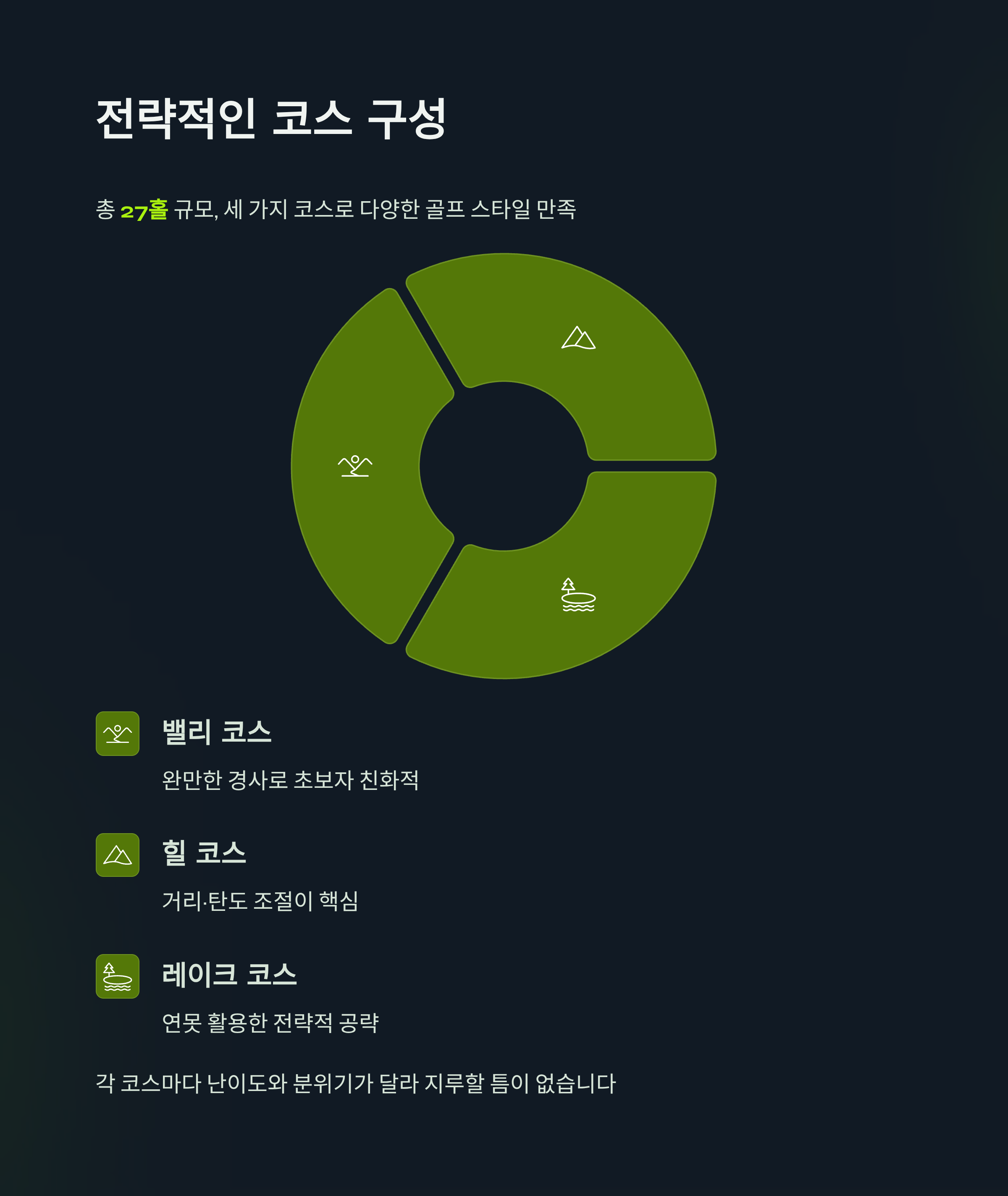 각 코스는 난이도와 분위기가 서로 달라 다양한 골프 스타일을 만족시켜줍니다.