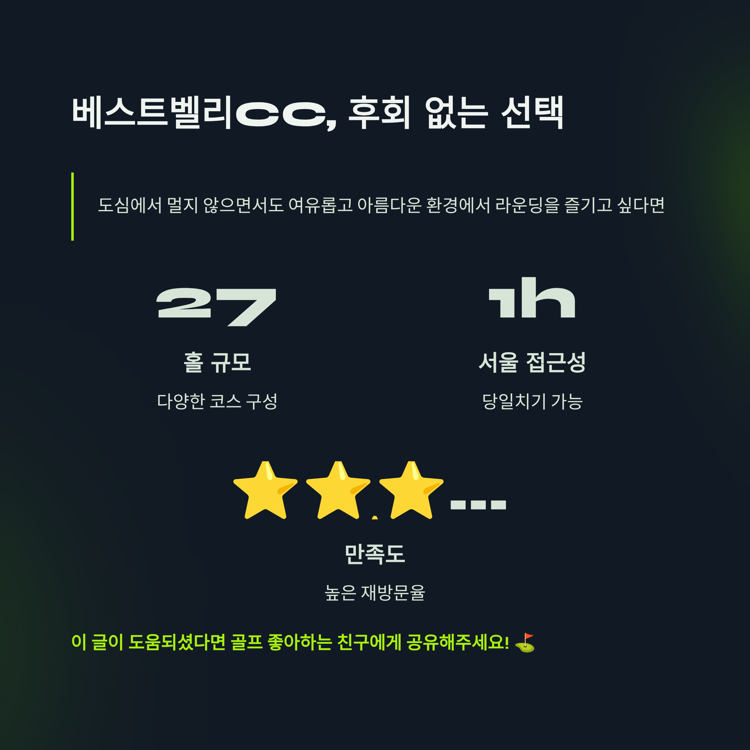 도심에서 멀지 않으면서도 여유롭고 아름다운 환경에서 라운딩을 즐기고 싶다면, 베스트벨리CC는 후회 없는 선택이 될 수 있습니다.